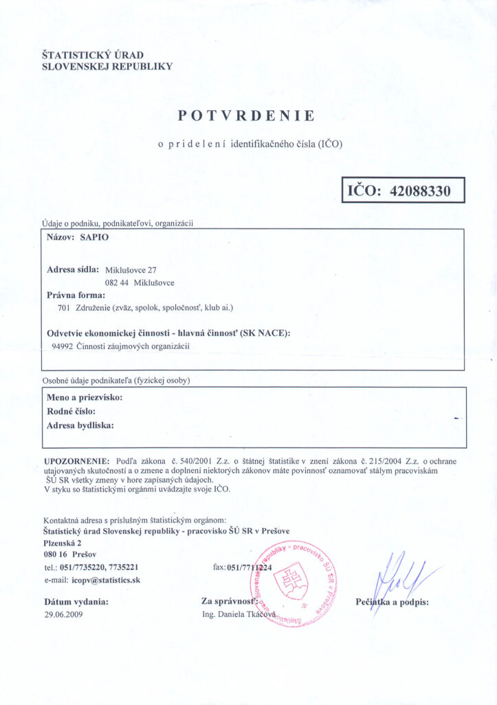dokumenty Stanovy združenia Sapio_stanovyStiahnuť Žiadosť o členstvo v združení žiadosť o prijatie za člena SAPIOStiahnuť Potvrdenie o prideleni IČO Logo OZ SAPIO Logo BADROS výročné správy: 2009 výročná správa 2012Stiahnuť 2011 výročná správa 2011Stiahnuť 2012 výročná správa 2012Stiahnuť